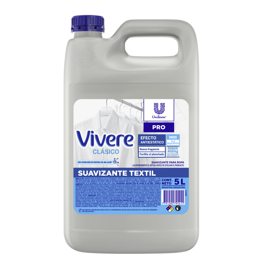 Suavizante textil antiestático. Formulado a base de activo catiónico que genera efecto antiestático sobre las fibras. Facilitador del planchado y neutralizador de olores.
